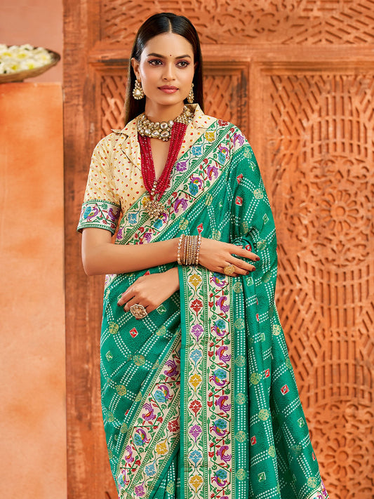 Teal Green Printed Bandhani Silk Saree