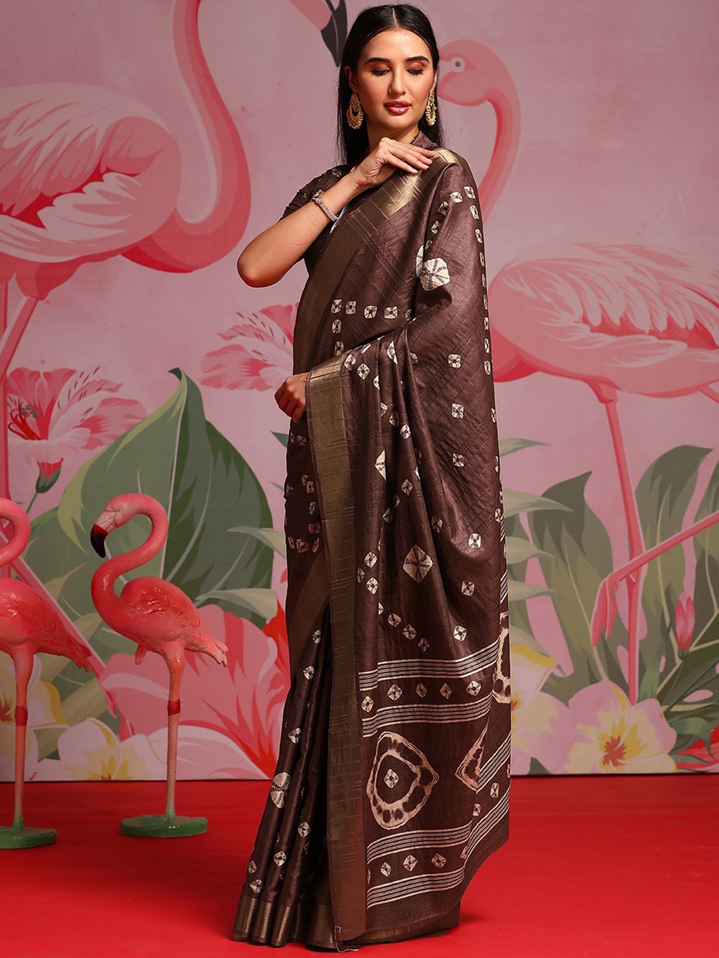 Coffee Brown Printed Bandhani Silk Saree