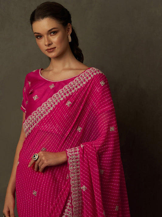 Pink Bandhani Chiffon Embellished Saree