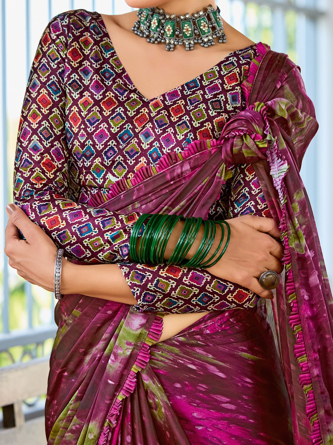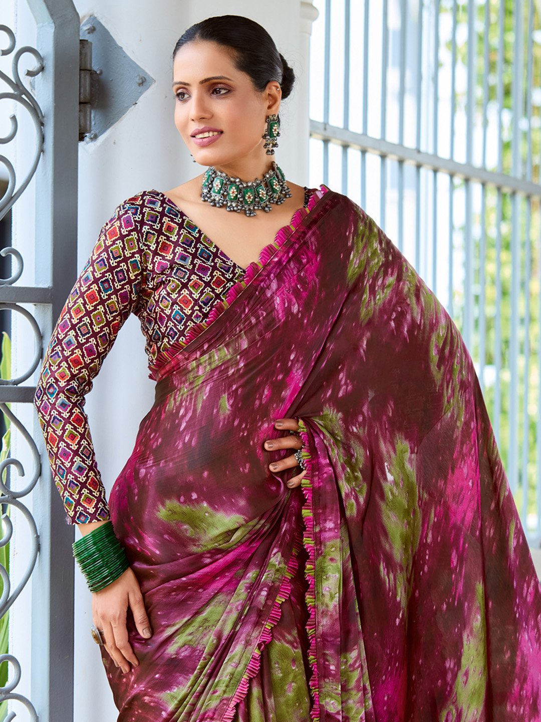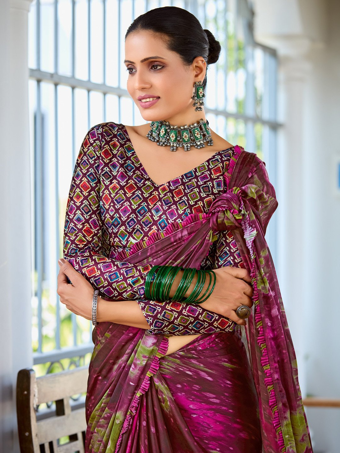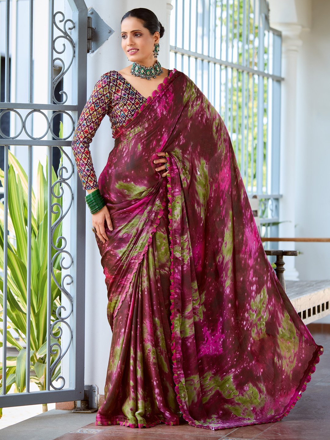 brown satin silk printed saree women ethnic traditional partywear wedding festive stylish elegant designer lightweight soft comfortable premium quality rich texture graceful chic versatile heritage classic modern occasion collection