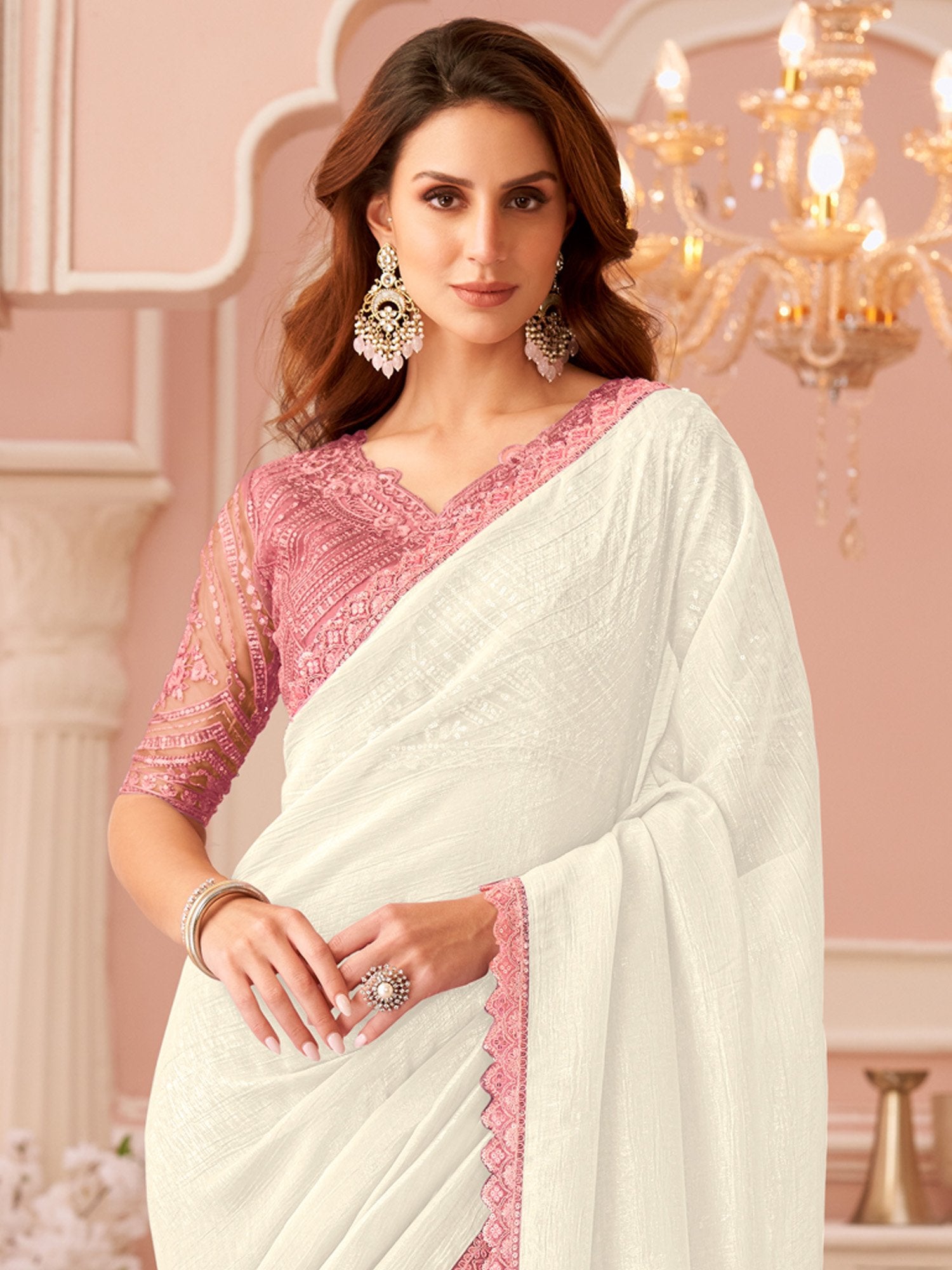 white party wear georgette saree women fashion ethnic traditional wedding festive partywear lightweight soft comfortable elegant designer woven premium quality rich texture graceful stylish trend occasion daily wear collection heritage classic