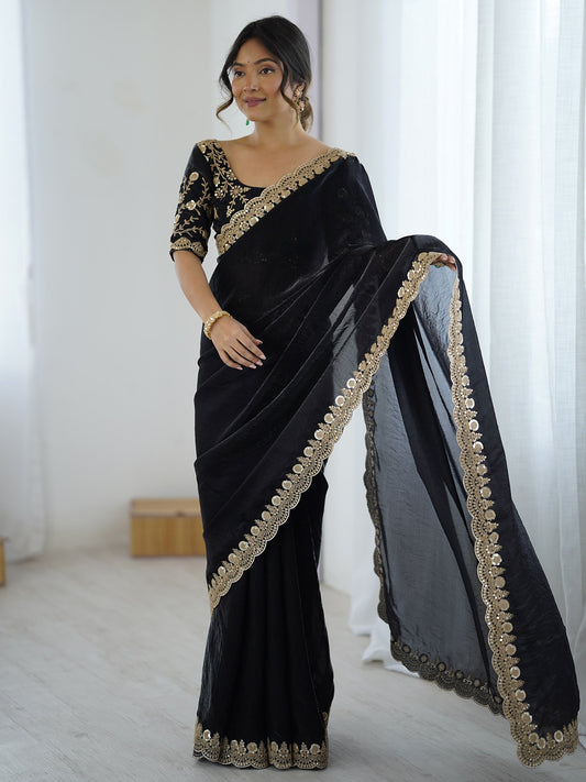 Black Party Wear Satin Embellished Saree