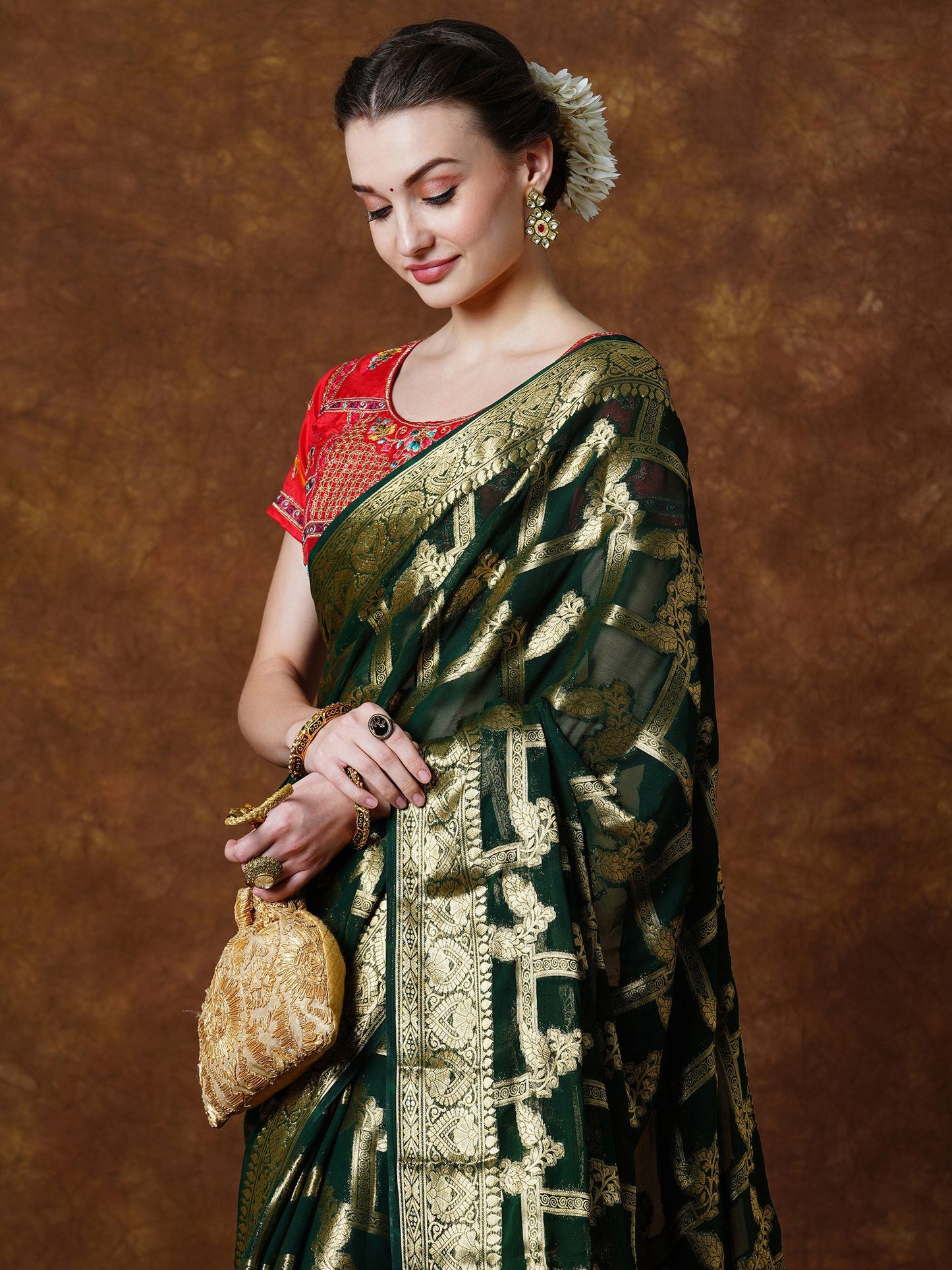 green georgette woven saree women ethnic traditional partywear wedding festive stylish elegant designer lightweight soft comfortable premium quality rich texture graceful chic versatile heritage classic modern occasion collection banarasi