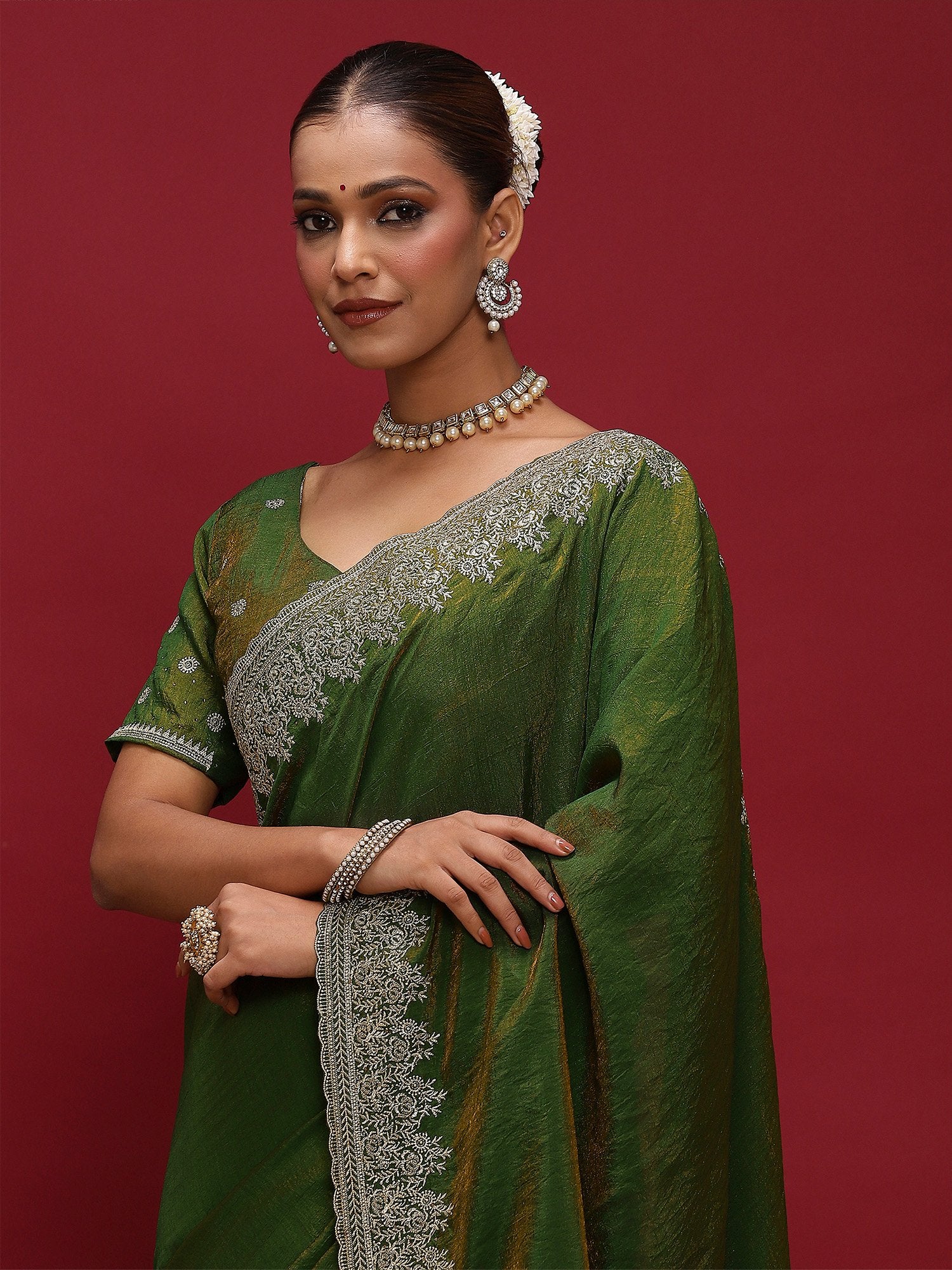 green party wear silk blend saree women fashion ethnic traditional wedding festive partywear lightweight soft comfortable elegant designer woven premium quality rich texture graceful stylish trend occasion daily wear collection heritage classic