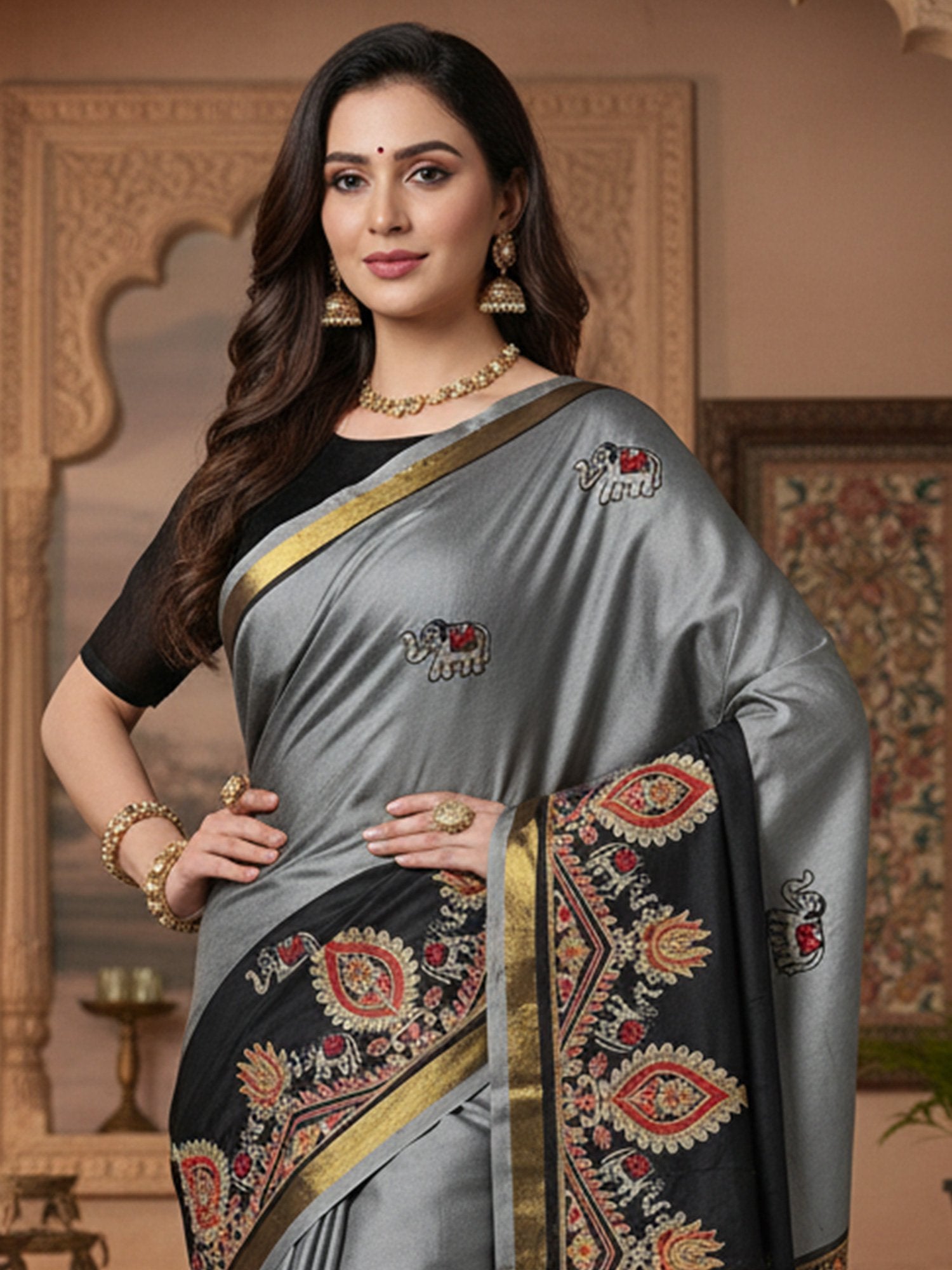 grey banarasi aura saree women fashion ethnic traditional wedding festive partywear lightweight soft comfortable elegant designer embroidered premium quality rich texture graceful stylish trend occasion daily wear collection heritage classic