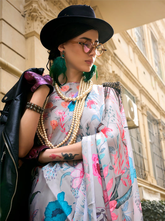 Light Grey Printed Satin Silk Saree