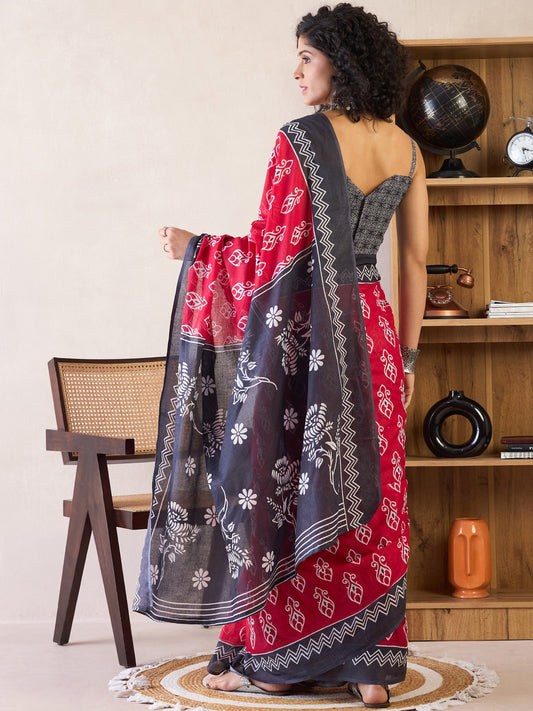 Greyish Red Printed Satin Silk Saree