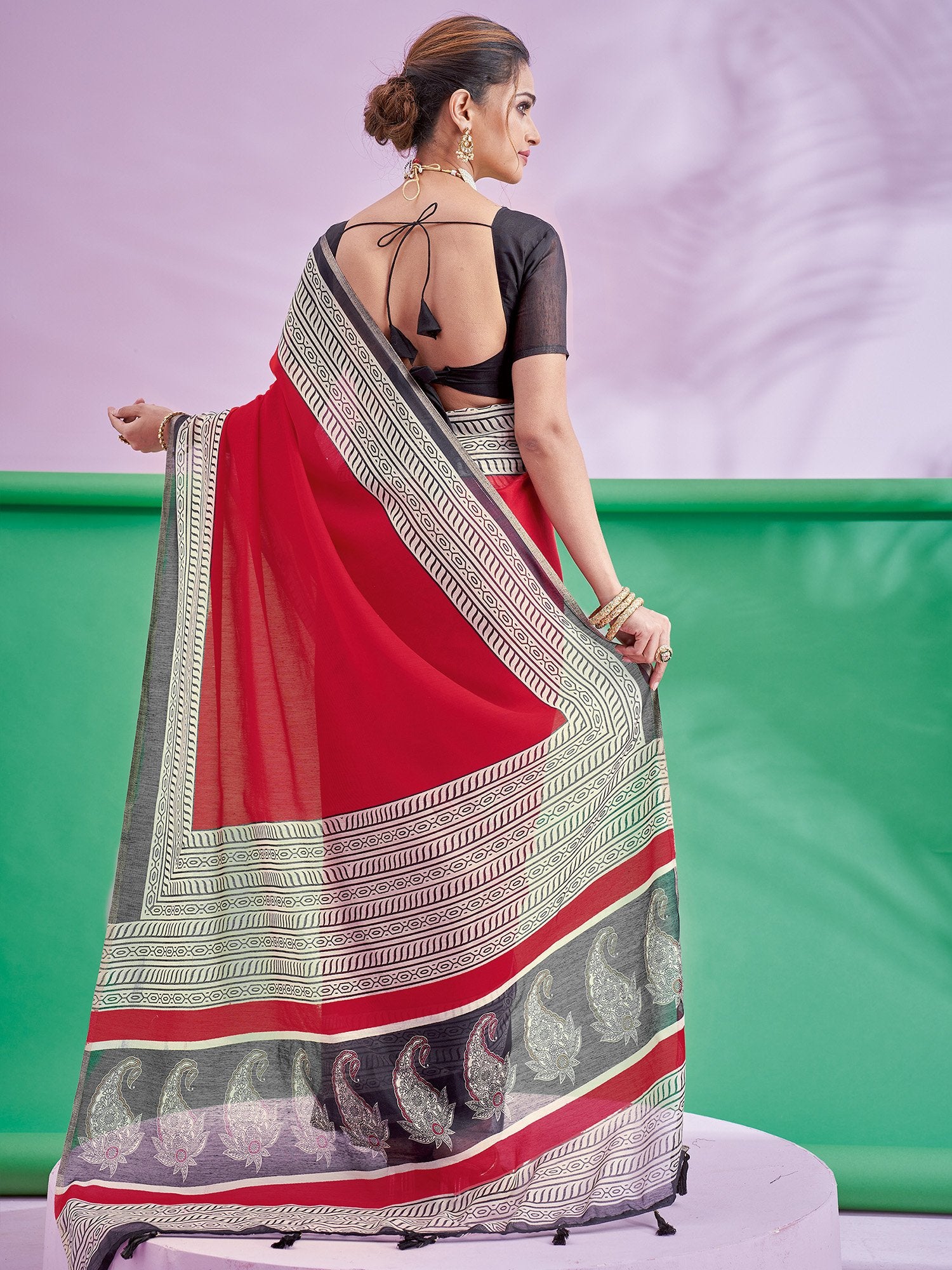 red block print cotton linen saree women fashion ethnic traditional wedding festive partywear lightweight soft comfortable elegant designer woven premium quality rich texture graceful stylish trend occasion daily wear collection heritage classic