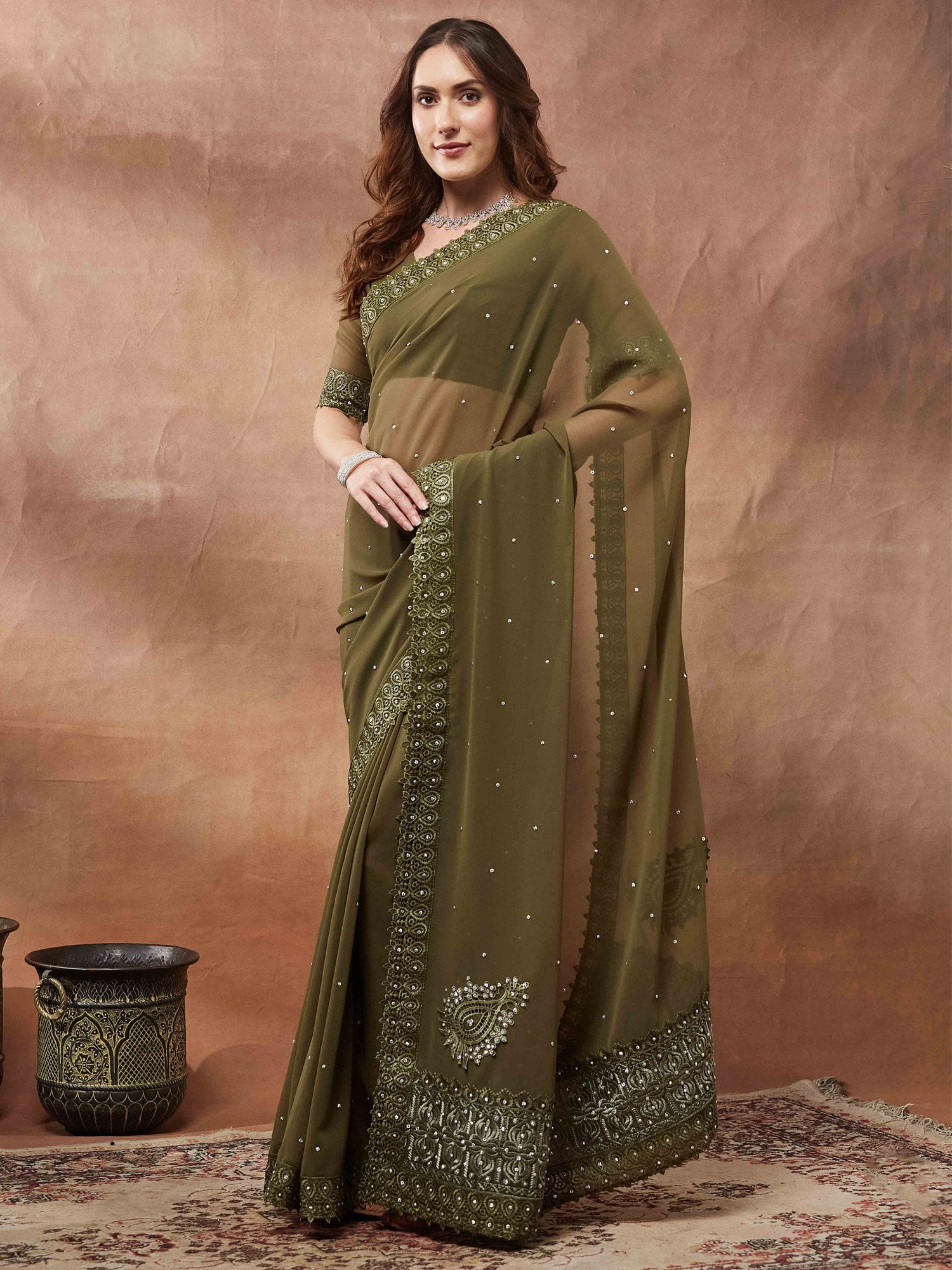 Olive Party Wear Georgette Embellished Saree