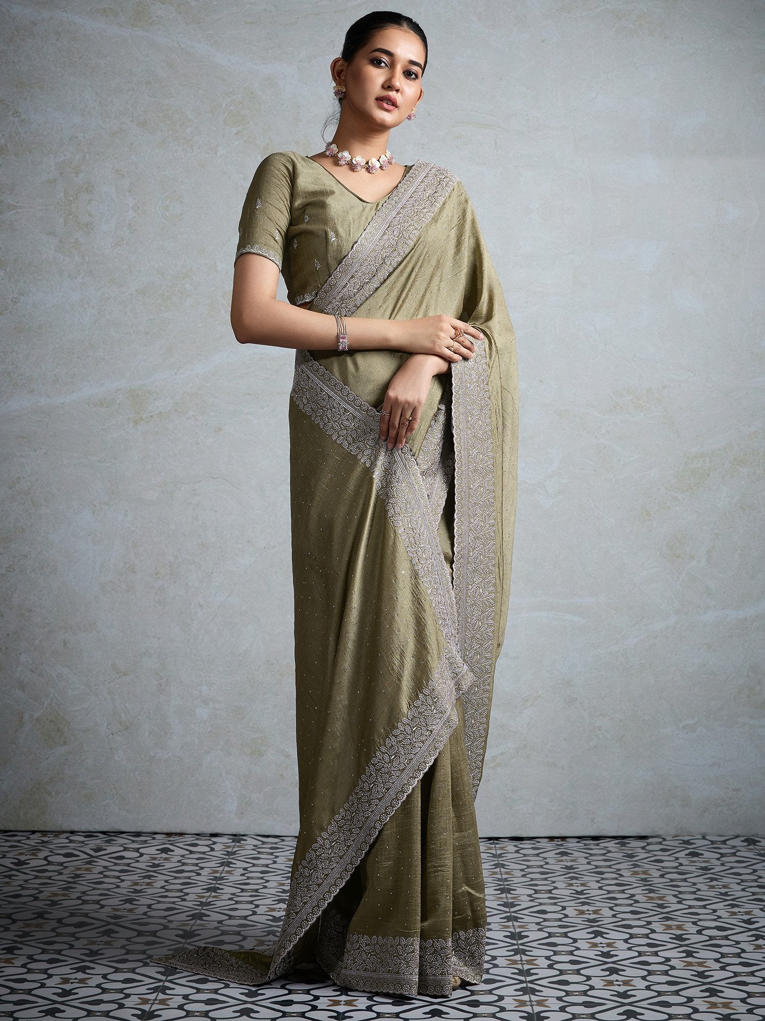 olive party wear vichitra silk saree women fashion ethnic traditional wedding festive partywear lightweight soft comfortable elegant designer woven premium quality rich texture graceful stylish trend occasion daily wear collection heritage classic