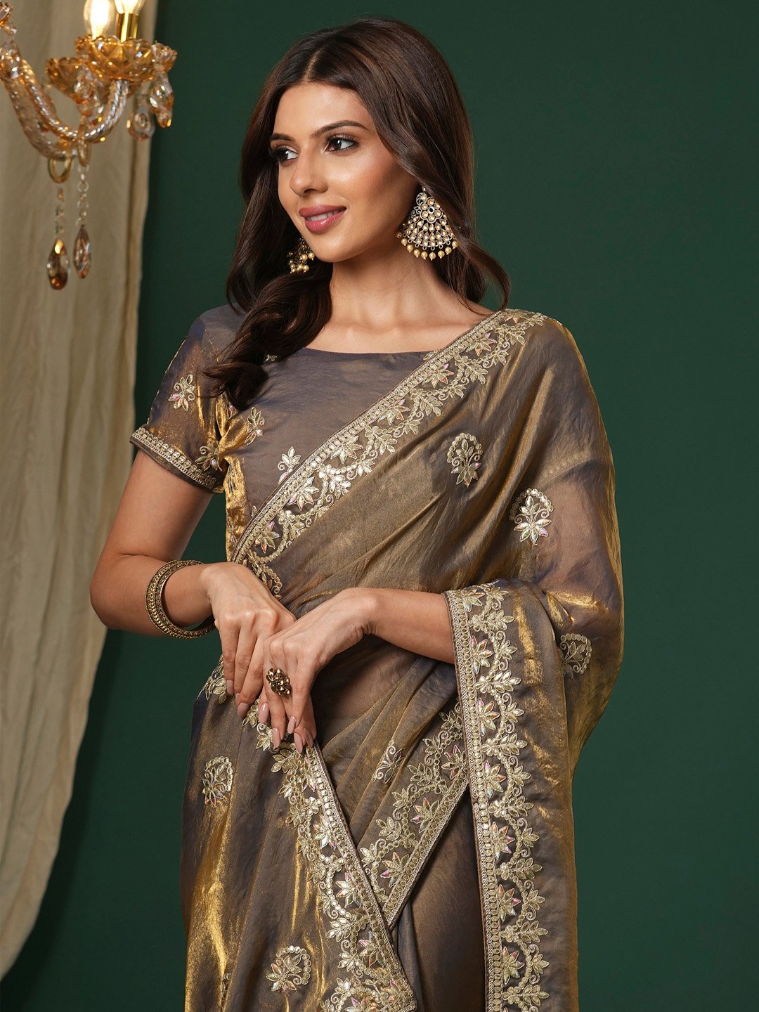 bronze satin silk woven saree women ethnic traditional partywear wedding festive stylish elegant designer lightweight soft comfortable premium quality rich texture graceful chic versatile heritage classic modern occasion collection organza