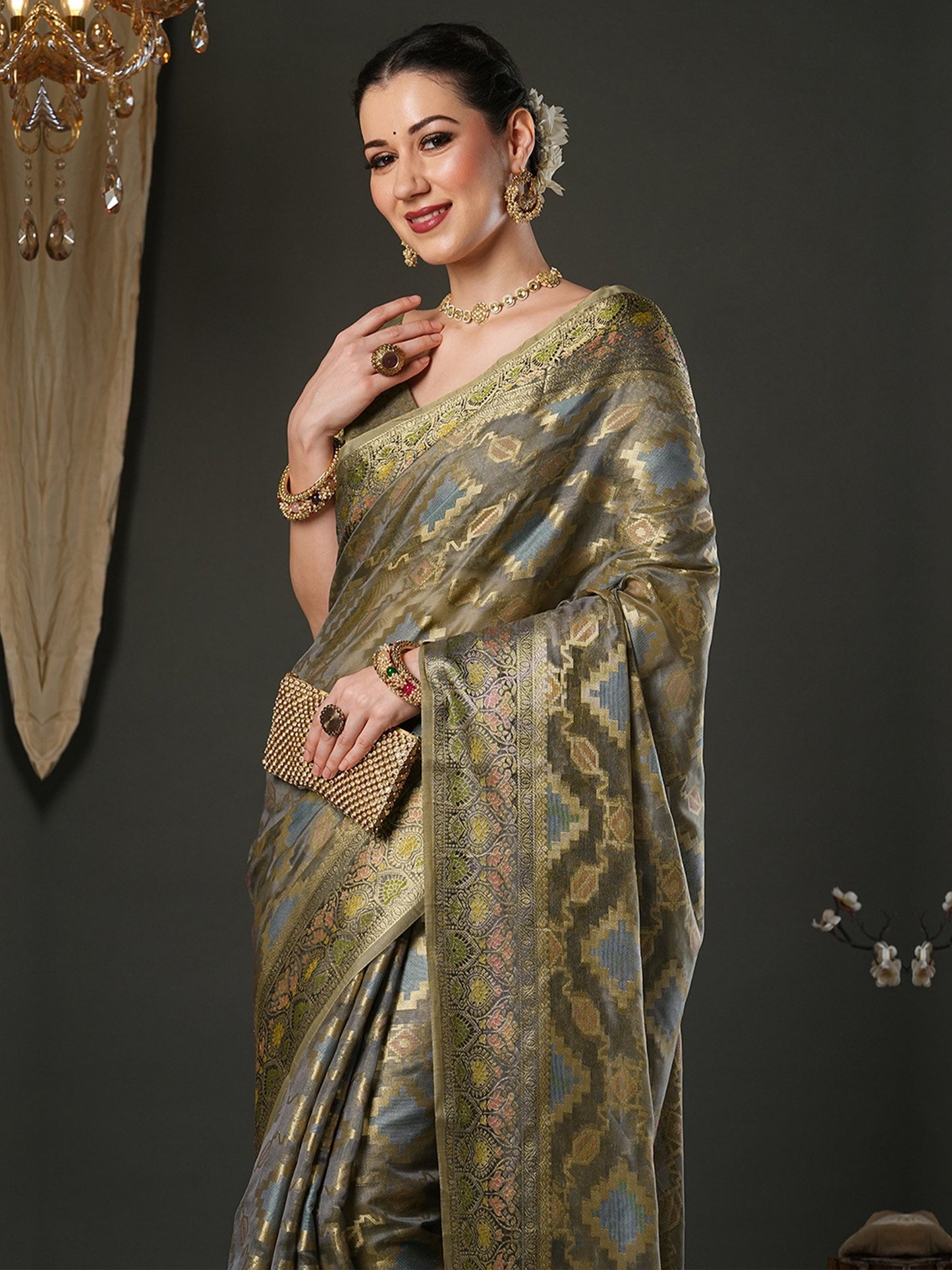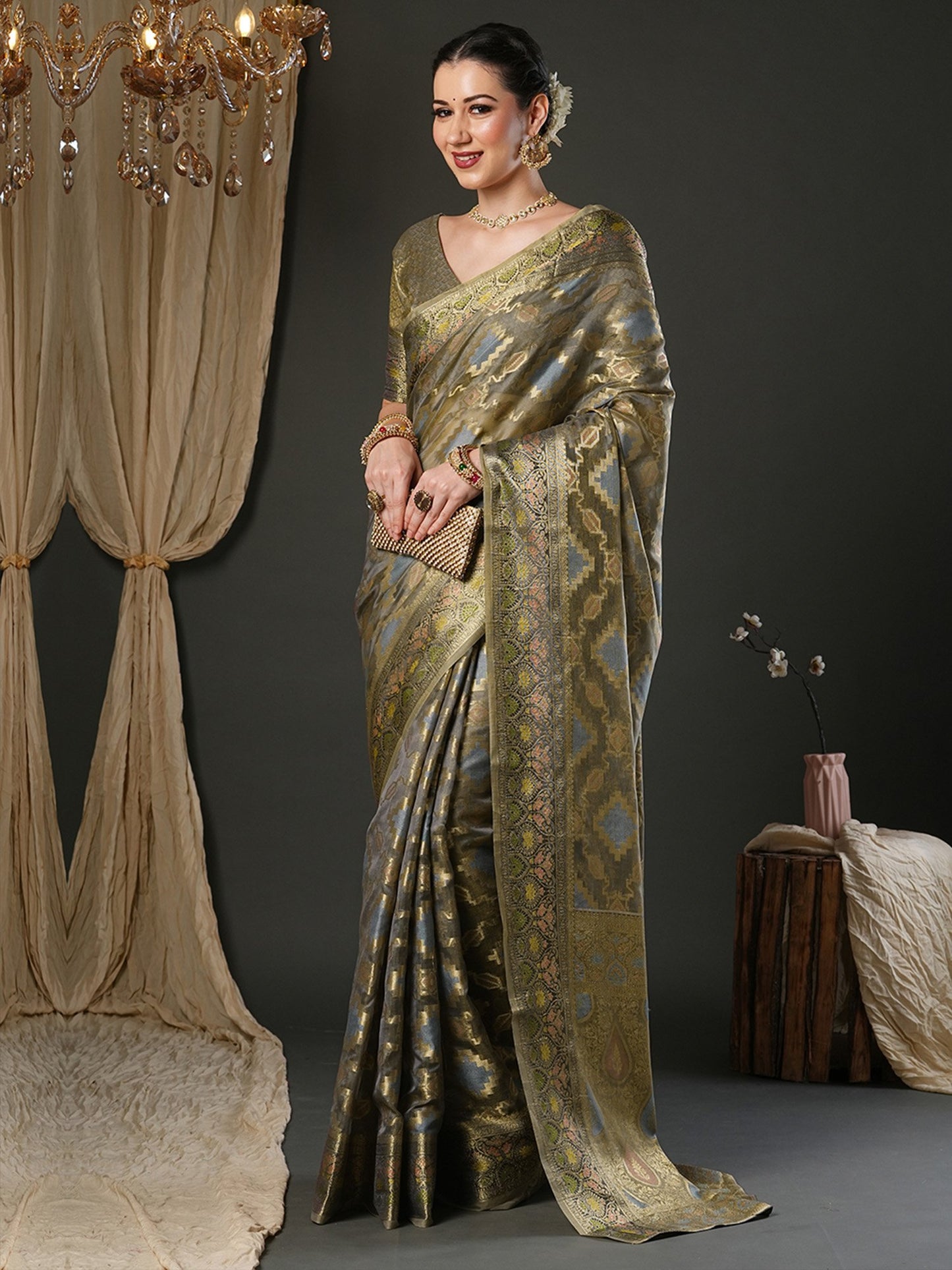 grey banarasi organza saree women fashion ethnic traditional wedding festive partywear lightweight soft comfortable elegant designer woven premium quality rich texture graceful stylish trend occasion daily wear collection heritage classic