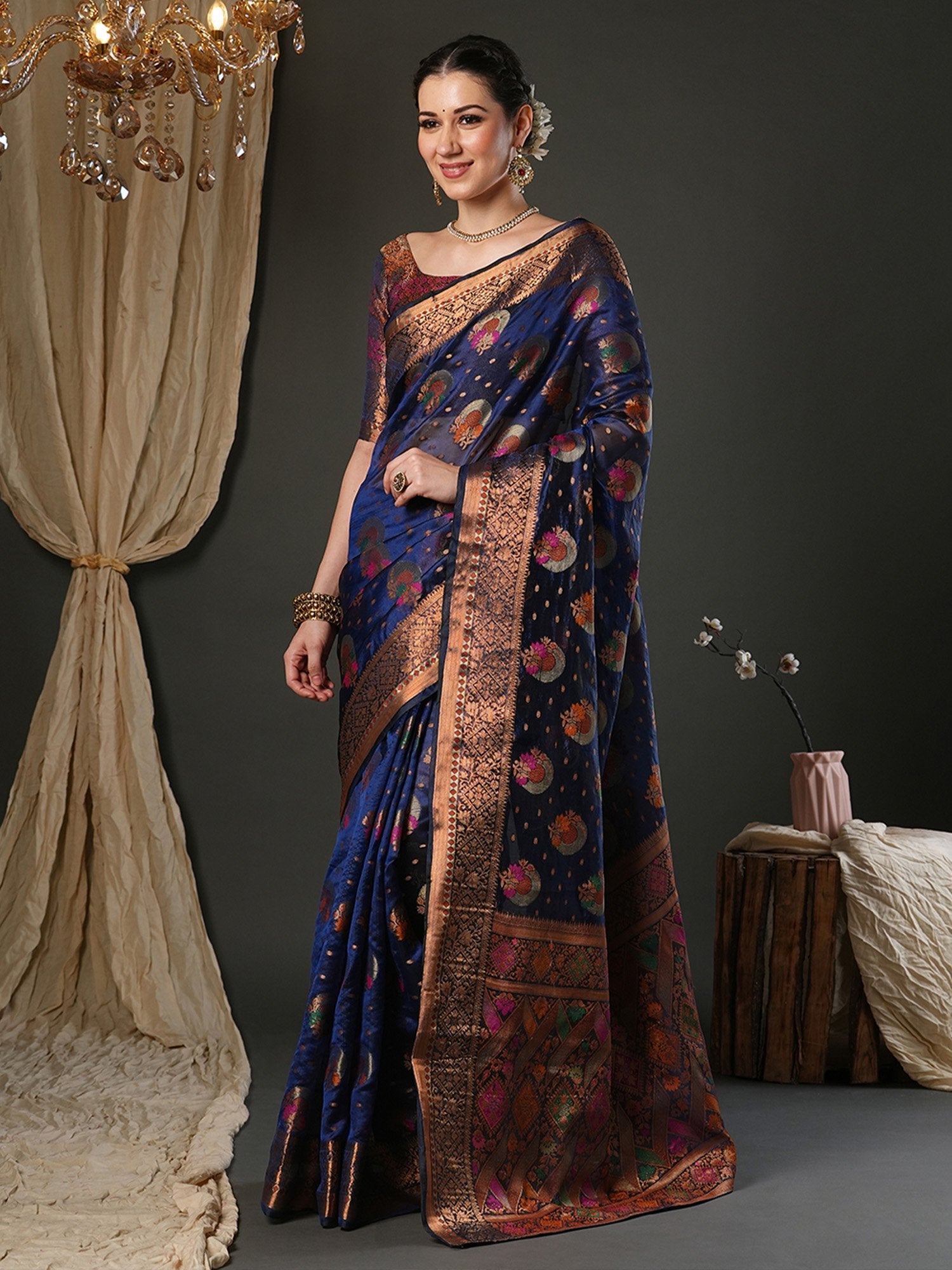 navy blue banarasi organza saree women fashion ethnic traditional wedding festive partywear lightweight soft comfortable elegant designer woven premium quality rich texture graceful stylish trend occasion daily wear collection heritage classic