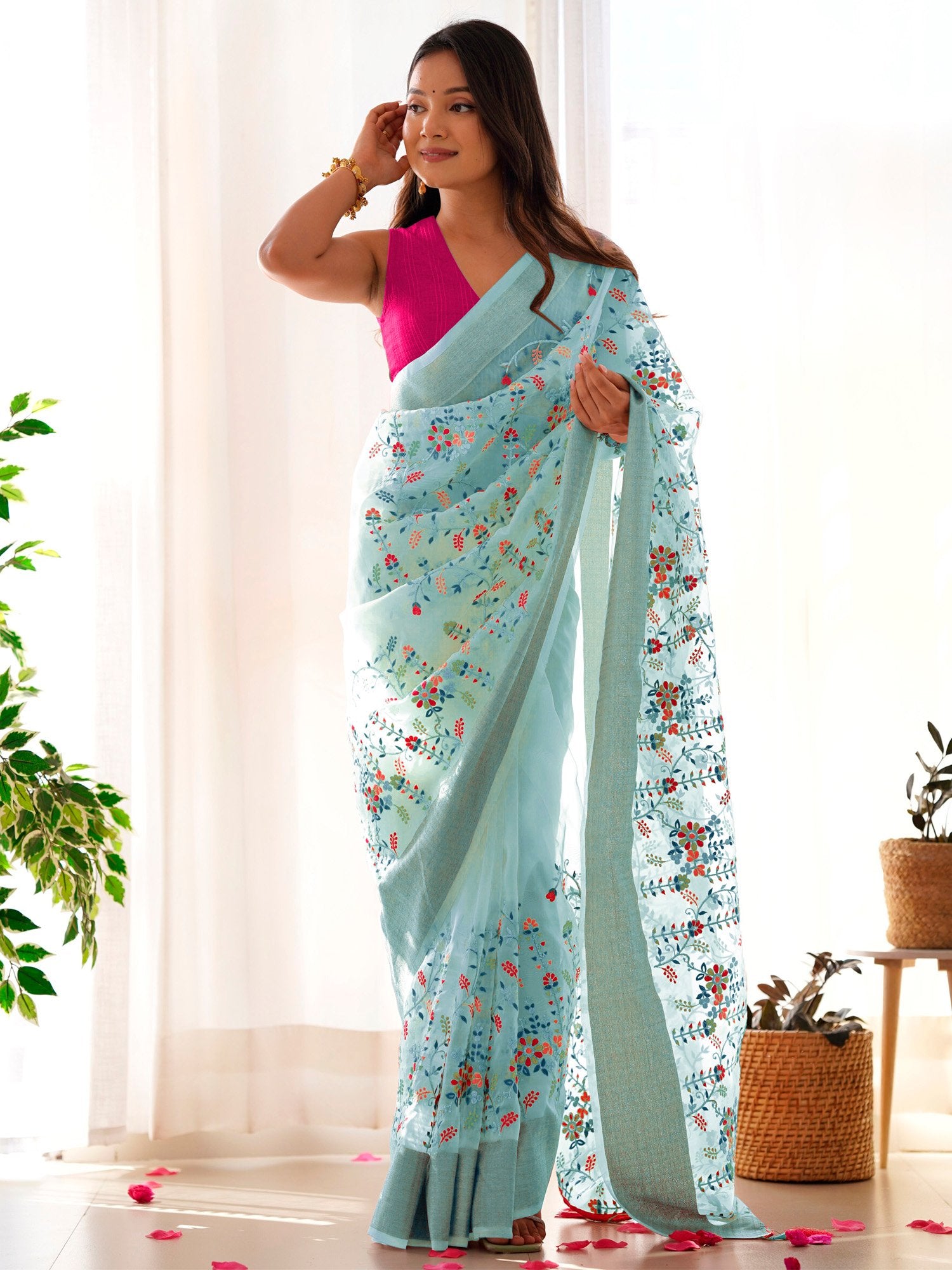 light blue organza woven saree women ethnic traditional partywear wedding festive stylish elegant designer lightweight soft comfortable premium quality rich texture graceful chic versatile heritage classic modern occasion collection blue