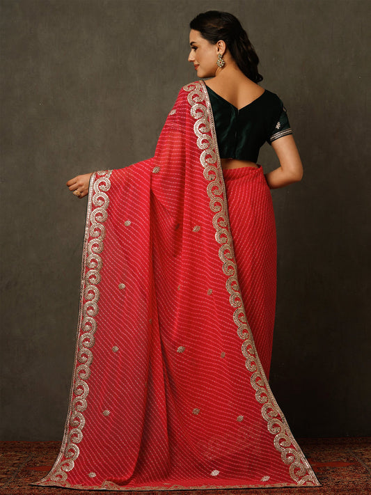 Red Sheer Chiffon Designer Partywear Saree