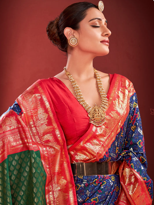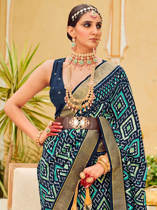 Navy Blue Gujarati Traditional Festive Patola Print Silk Saree