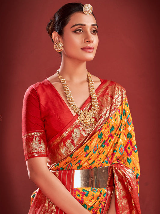 Gujrati Mustard Traditional Ikat Patola Silk Saree