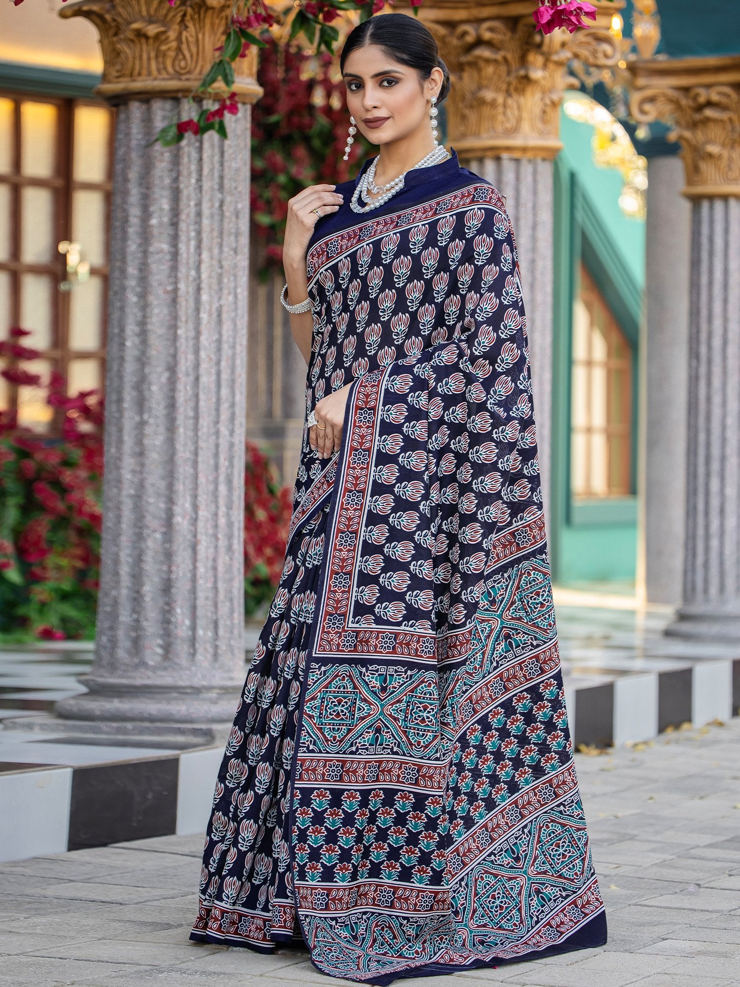 Navy Bagru Bhagalpuri Silk Printed Saree