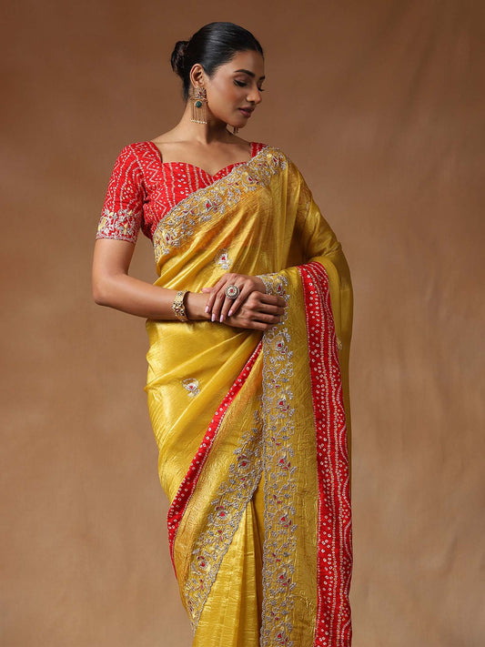 Yellow Party Wear Tissue Embellished Saree