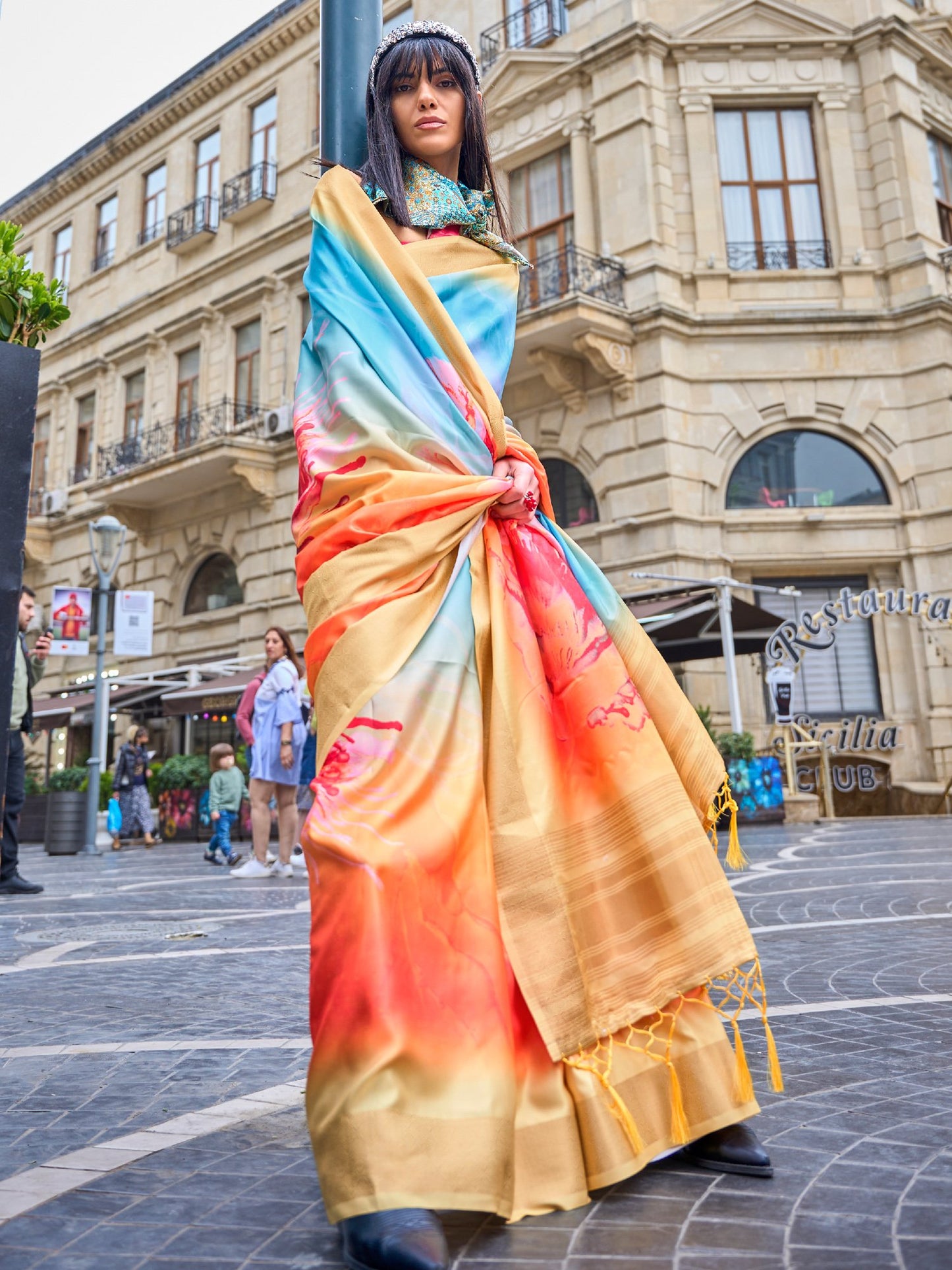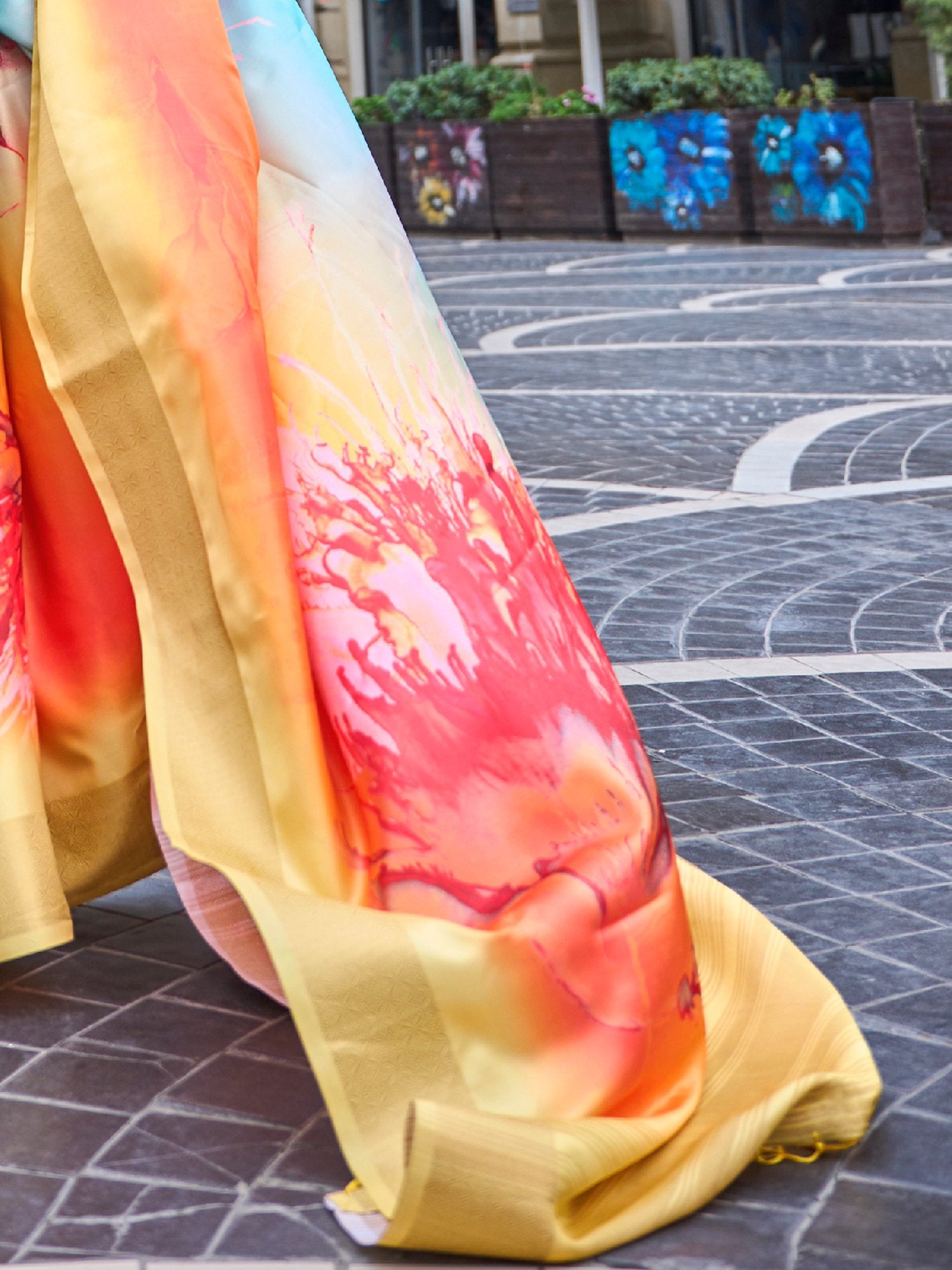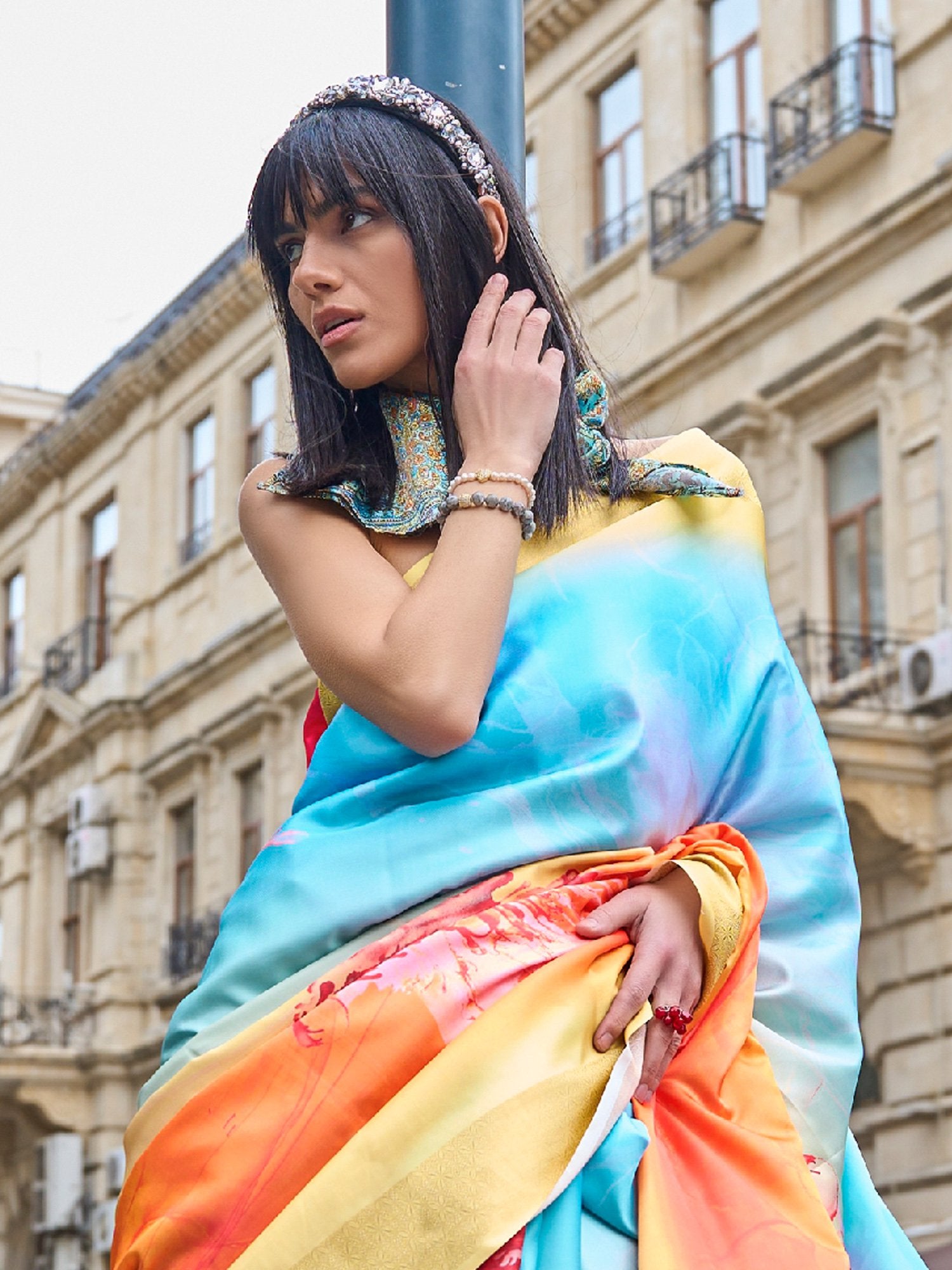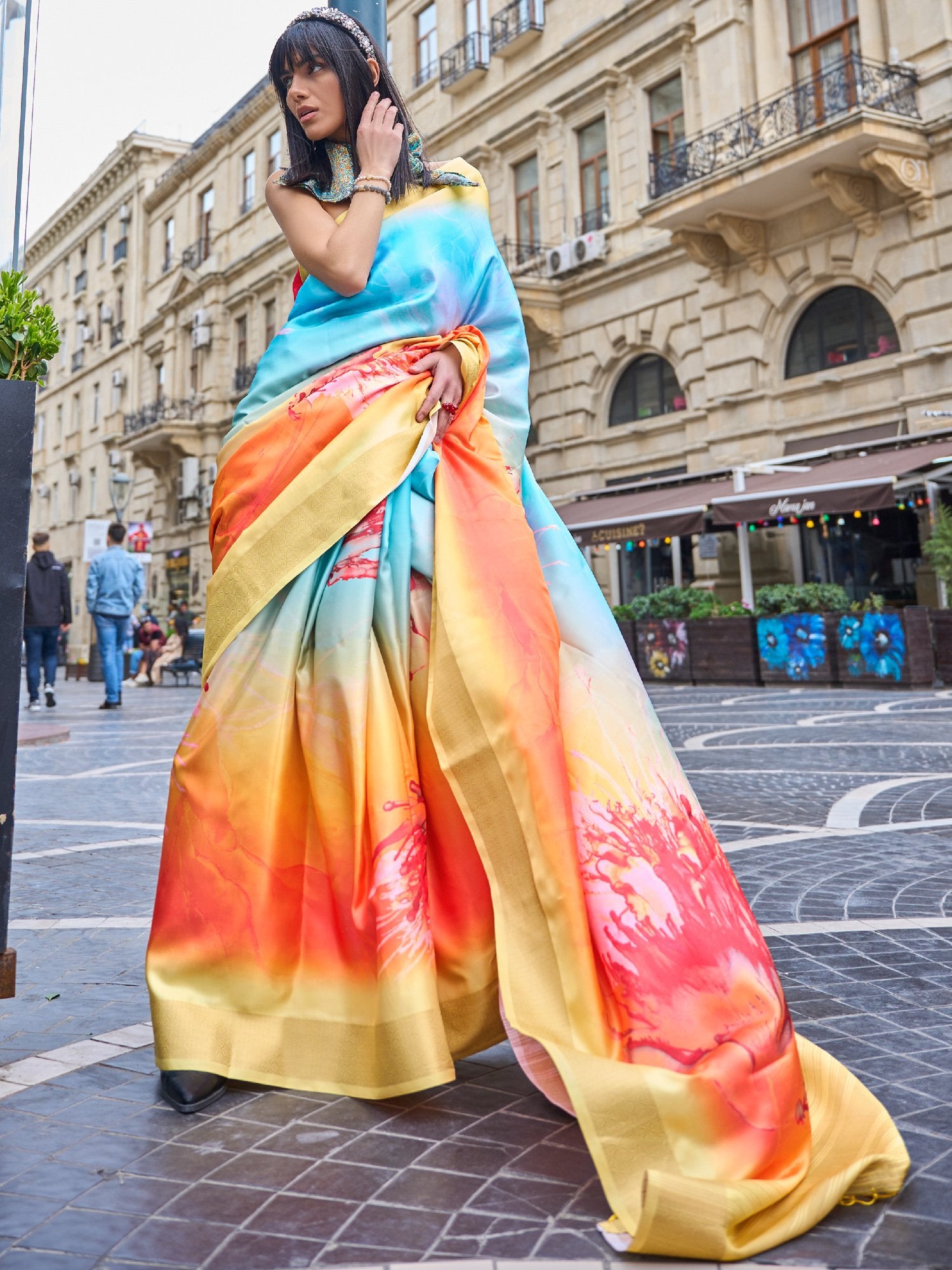 Yellowish Blue Digital Print Silk Saree