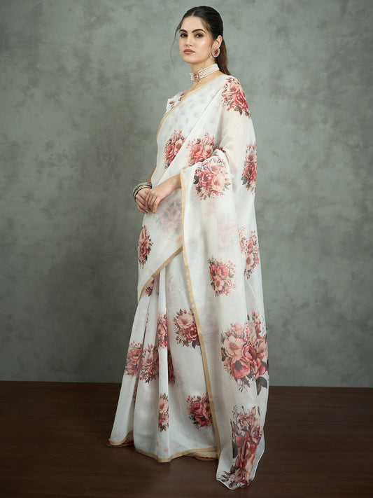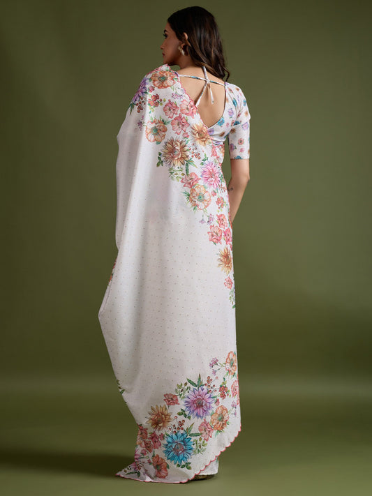 White Party Wear Chiffon Printed Saree
