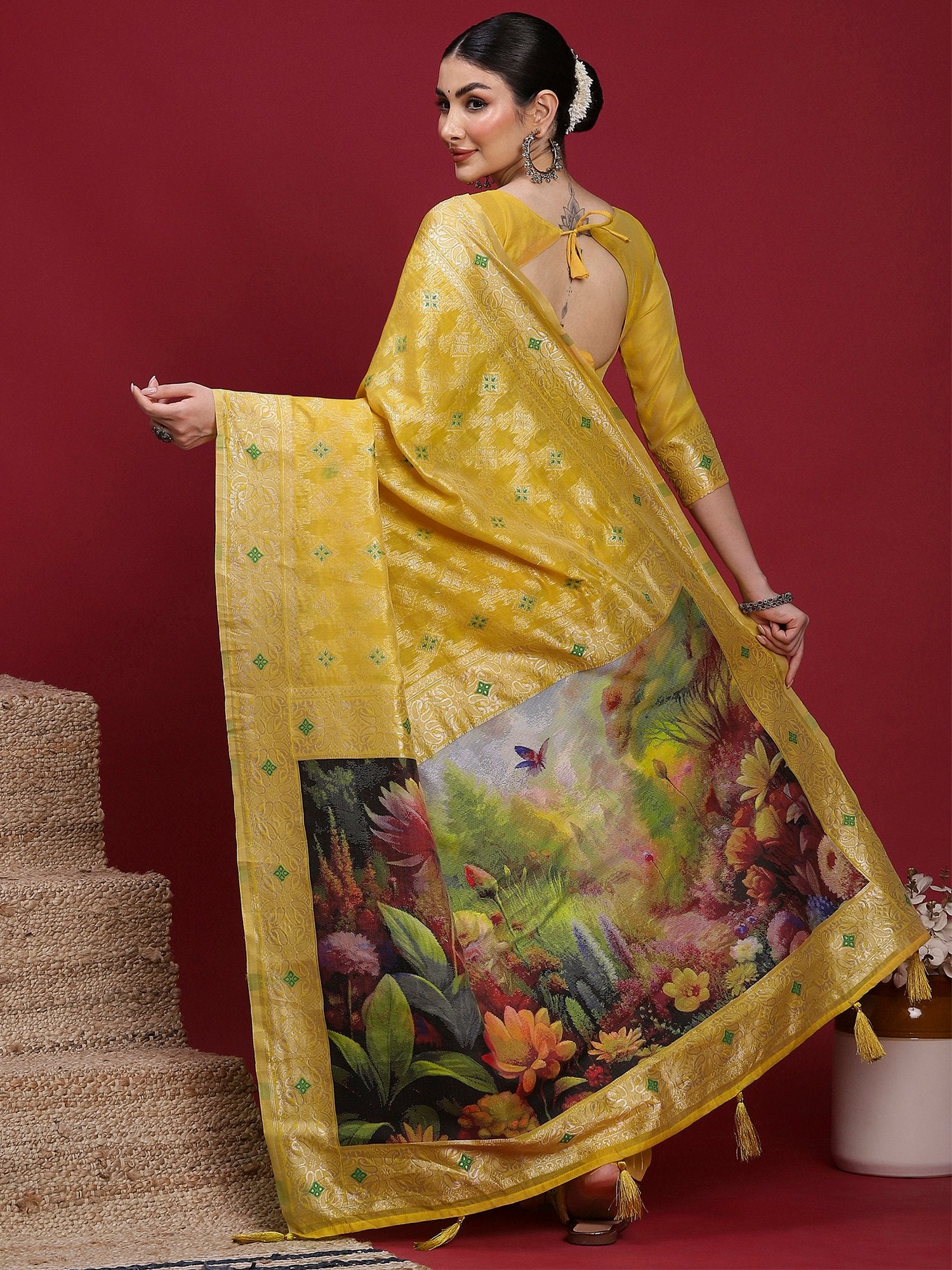 yellow banarasi organza saree women fashion ethnic traditional wedding festive partywear lightweight soft comfortable elegant designer woven premium quality rich texture graceful stylish trend occasion daily wear collection heritage classic