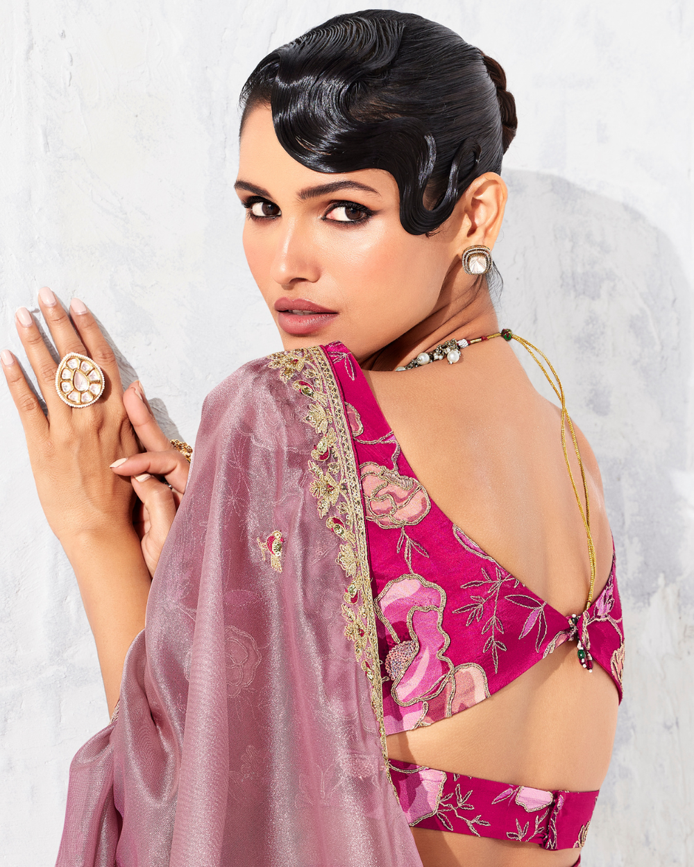 Elevate your ethnic wardrobe with this stunning lavender designer saree crafted from premium glass tissue and organza fabric. The saree features intricate sequin, thread, and dhaga embroidery work adorning the butti and border, creating a sophisticated visual appeal. Paired with a complementary pink satin silk blouse, this piece showcases digital print detailing and expertly embroidered sleeves and back neck. Perfect for weddings, celebrations, and special occasions, this saree combines traditional craftsmanship with contemporary design sensibilities, ensuring you stand out with grace and elegance.