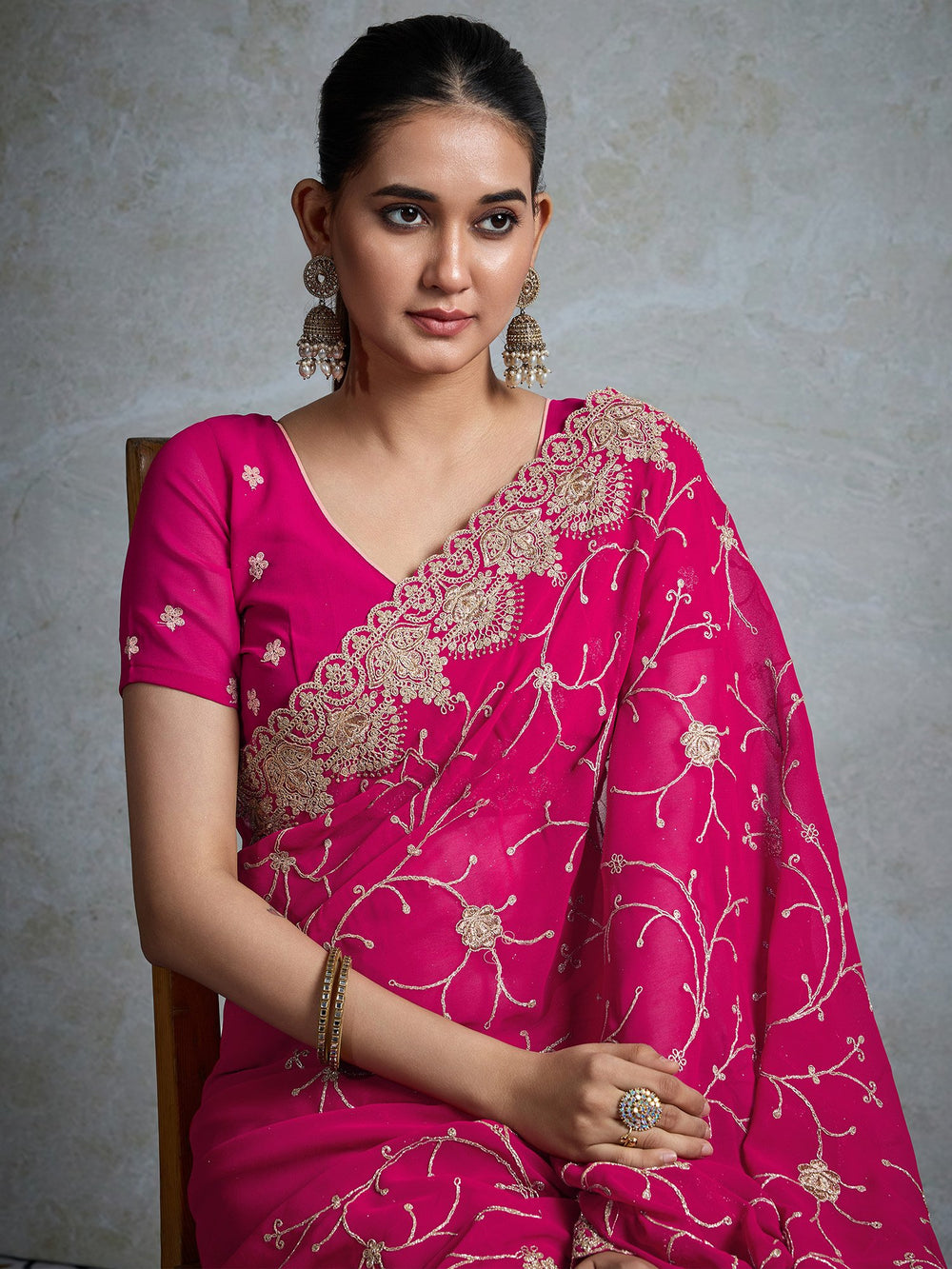 Pink party wear georgette saree women fashion ethnic traditional wedding festive partywear lightweight soft comfortable elegant designer embroidered premium quality rich texture graceful stylish trend occasion daily wear collection heritage classictype: party wearsaree fabric: georgetteblouse fabric: georgettesaree color: pinkblouse color: pinkblouse: with blouse piecesaree length (mtr): 5.5blouse length (mtr): 0.8saree width (mtr): 1.5
