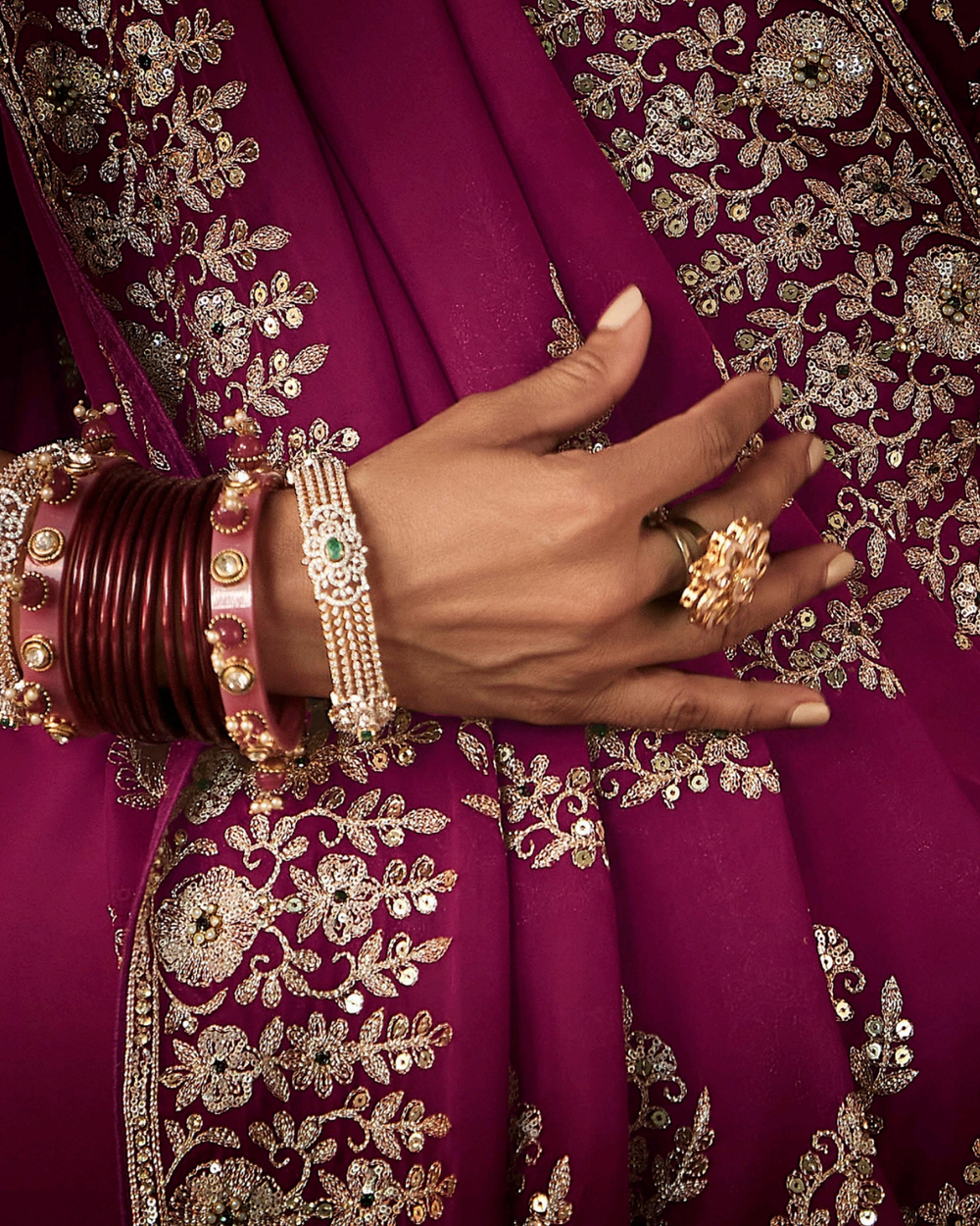 Elevate your ethnic wardrobe with this stunning purple georgette designer saree that seamlessly blends contemporary allure with classic sophistication. Crafted from luxurious georgette fabric, the saree drapes with effortless elegance, moving gracefully with your every gesture. Intricate embroidery work adorns the borders with a luminous shimmer, creating a captivating focal point. The coordinating all-over embellished blouse completes the ensemble, offering a harmonious balance of modern sensuality and timeless refinement.